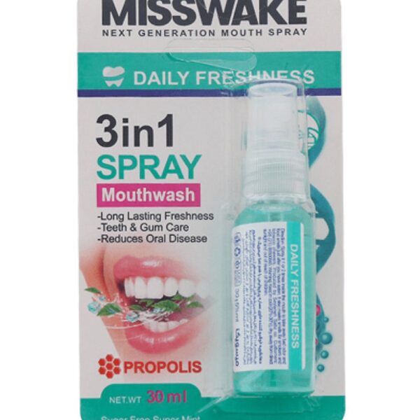 اسپری دهانشویه مدل ۳ در ۱ با طعم اوکالیپتوس و عصاره پروپولیس ۳۰ میل میسویک (Misswake )